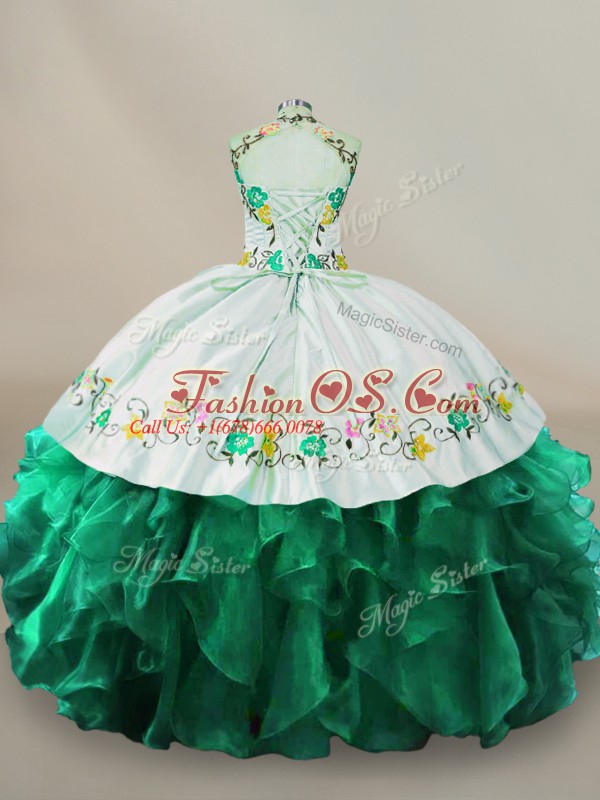 Modern Dark Green Ball Gowns Organza Halter Top Sleeveless Embroidery Floor Length Lace Up Ball Gown Prom Dress