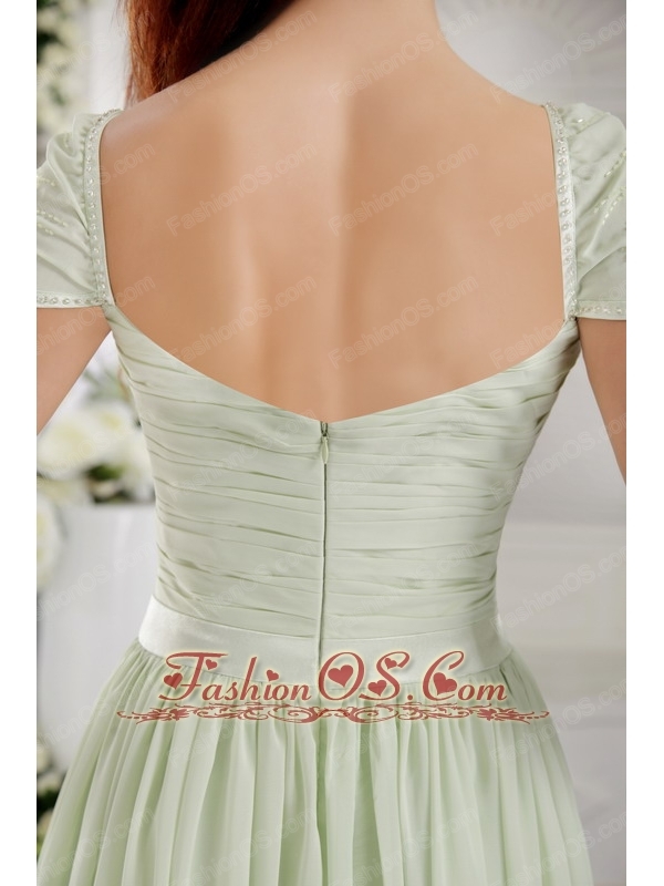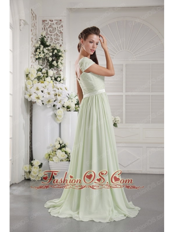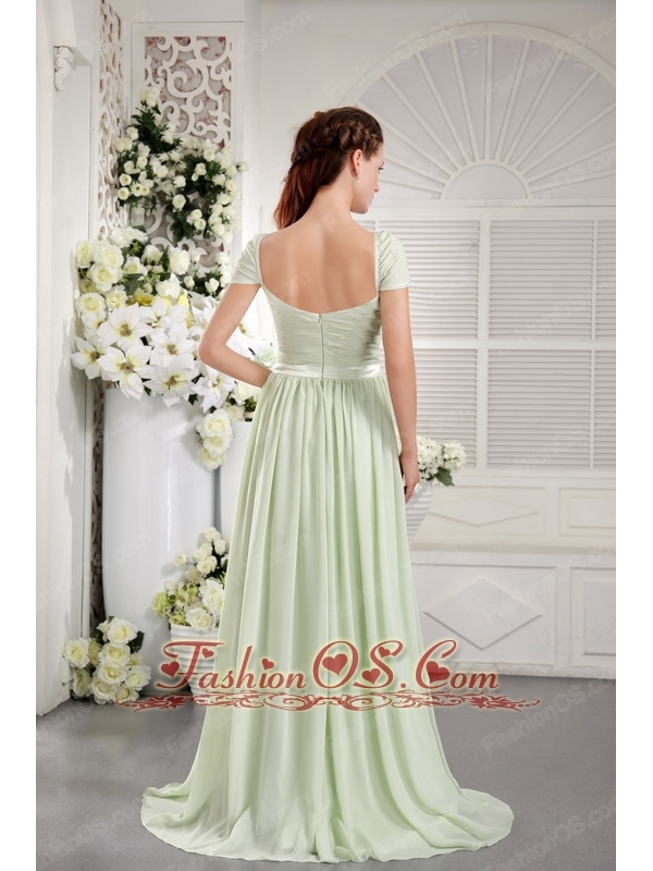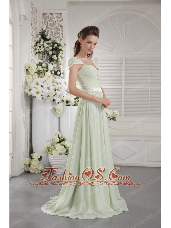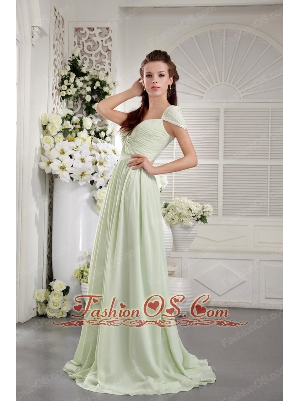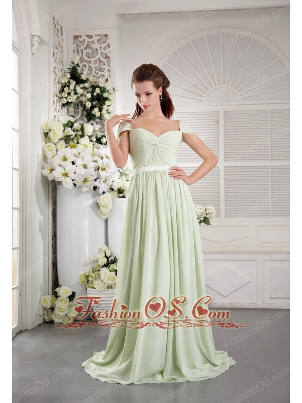 Apple Green Empire Off The Shoulder Brush Train Chiffon Ruch Bridesmaid Dress