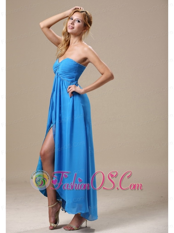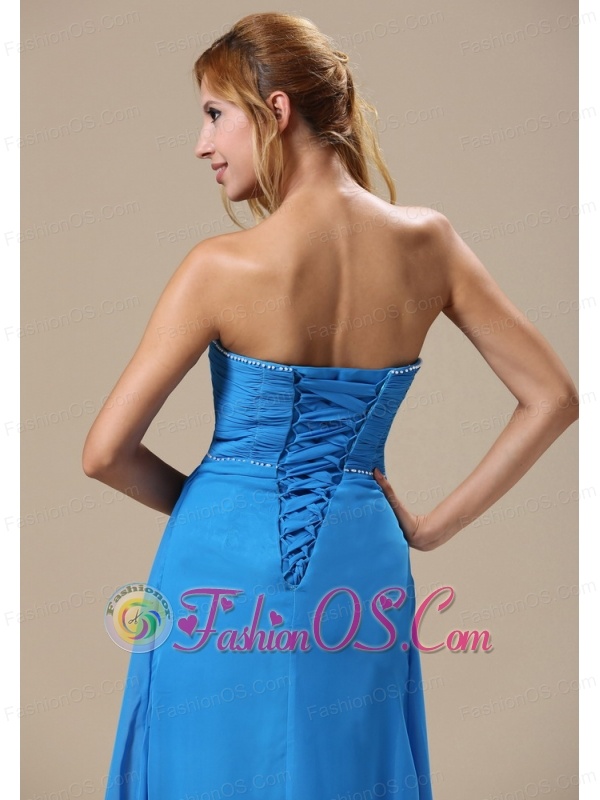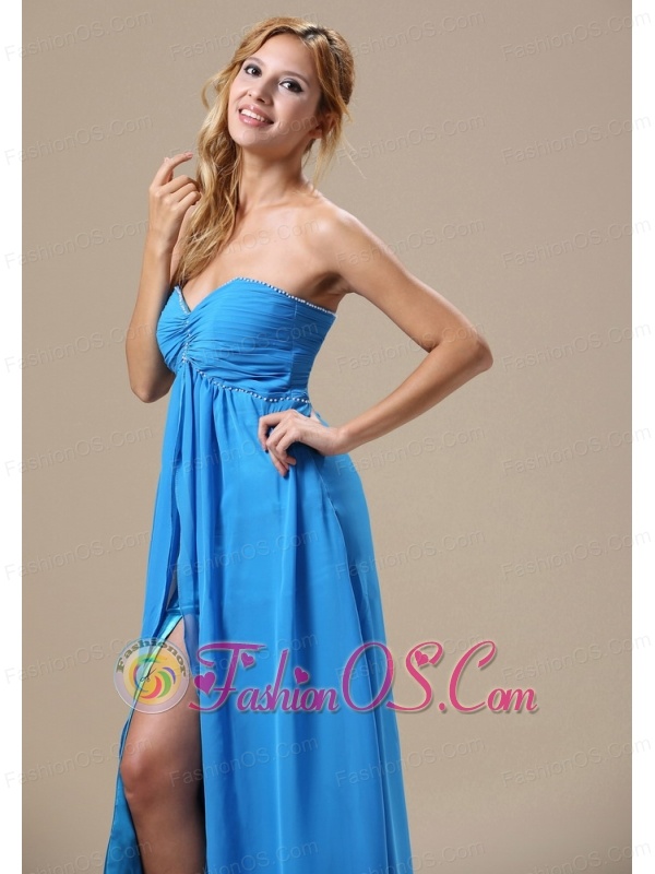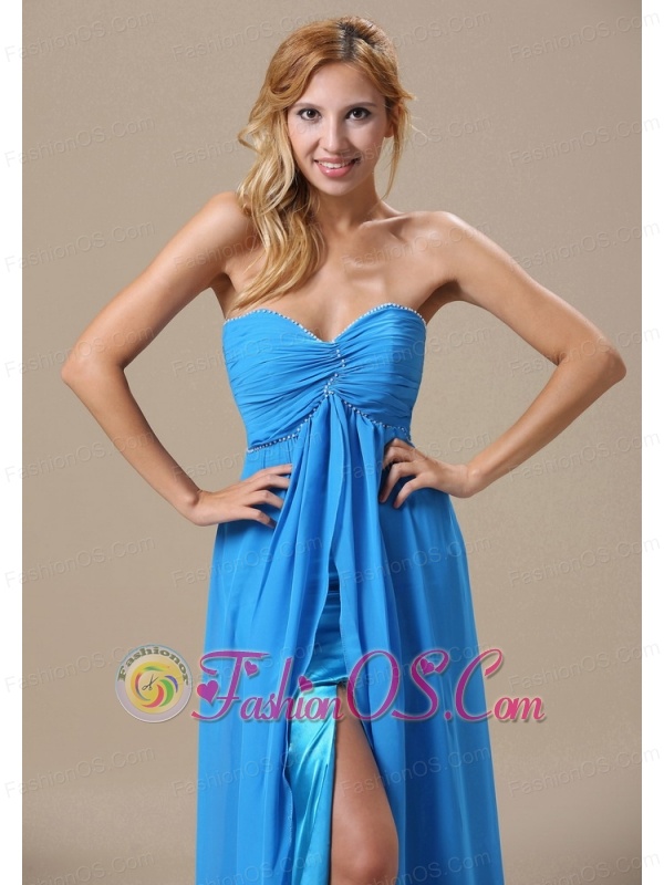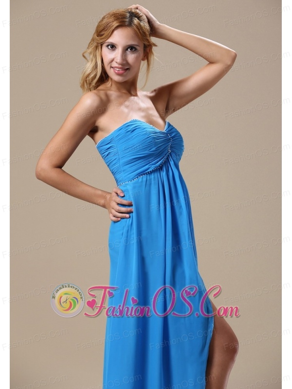 This gown is simply gorgeous!This romantic blue dress dropped naturallly and characterd with a sweetheart neckline in the front that you will looks sexy yet decent when you wear it.Pleated bodice modifites your charming figure.The slit skirt creates a beautiful shape to complete the dress.The You will be the shinning star when you go out in it.