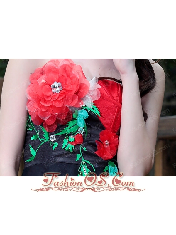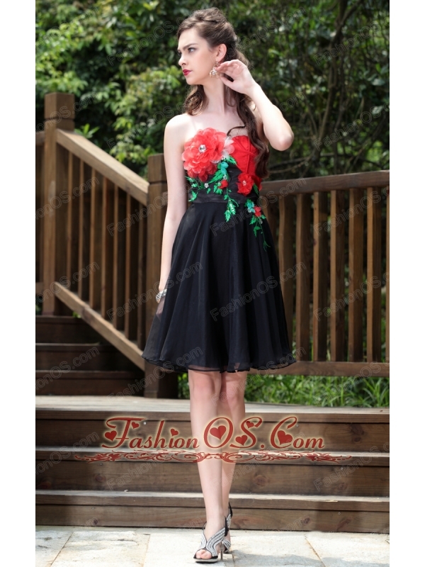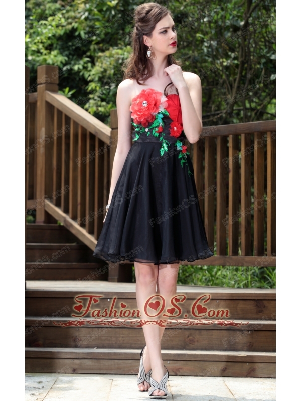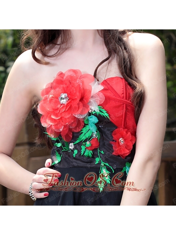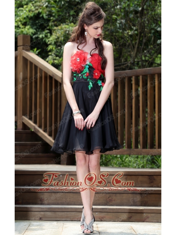 Elegent and romantic!The strapless bodice is accented with the big blooming red flowers and green leaves.The black chiffon skirt flowing freely.This short prom dress can completely represent your figure.