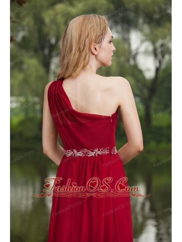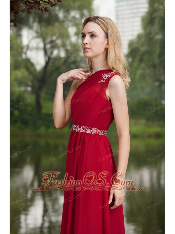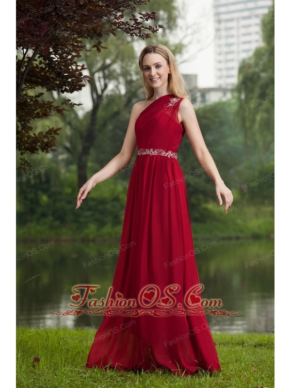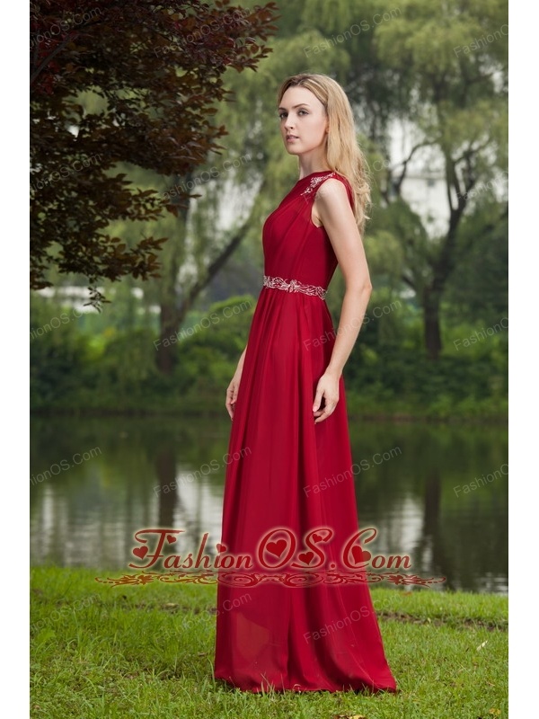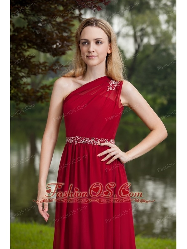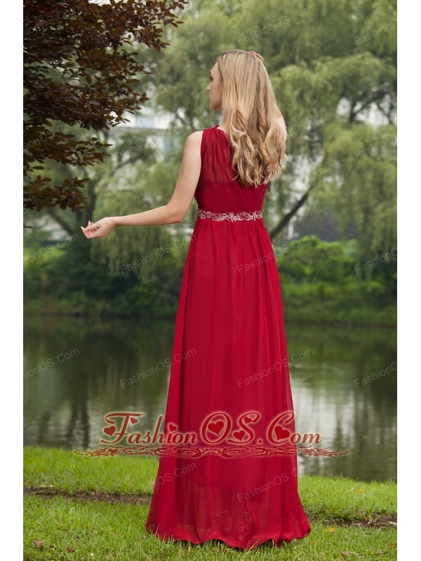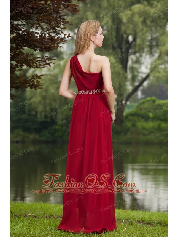 Wine Red Empire One Shoulder Floor-length Chiffon Beading Prom Dress