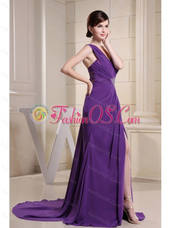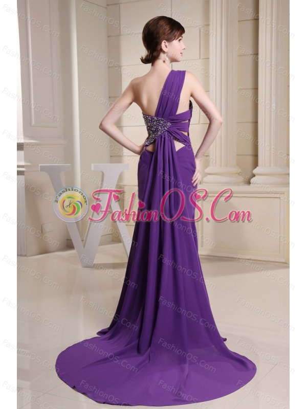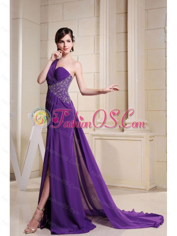 Elegant and sexy are the two words coming in your mind when you see this purple prom dress at your first sight. The dainty bodice adorned with one shoulder strap, exquisite ruchings, and a beawork decorated waist, which shows your natural waistline obviously. The floor length skirt with a slit flows freely to conture your slim figure and the brush train adds you the charm of being elegant and sexy. Special sexy back design completes this wonderful dress.