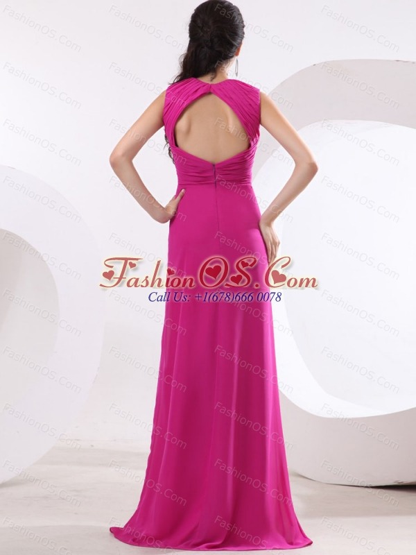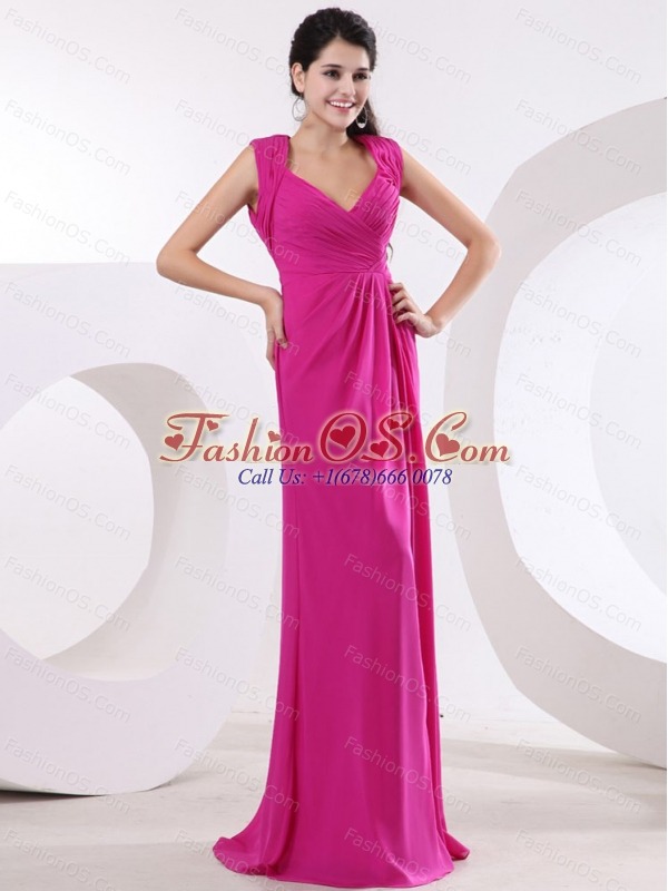 Fuchsia and V-neck For High Slit Prom Dress With Ruch and Brush Train